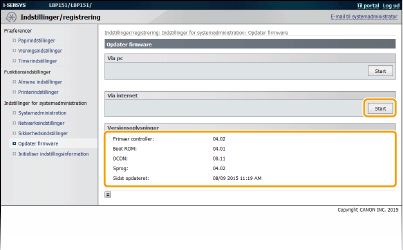 Vælg en metode til opdatering af firmwaren i overensstemmelse med den måde, maskinen er installeret på. Kontrollér versionen for maskinens firmware, og opdater via internettet fra maskinen, eller opdater fra en computer, som firmwaren er downloadet til.