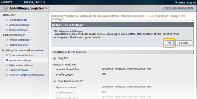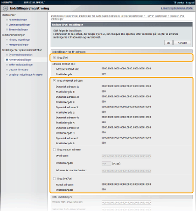 Brug Fjern-UI til at indstille IPv6-adresserne. Før du kan indstille IPv6-adresserne, skal du sørge for, at IPv4-adressen er blevet indstillet korrekt (Visning af netværksindstillinger). Du kan registrere op til ni af følgende IPv6-adresser.