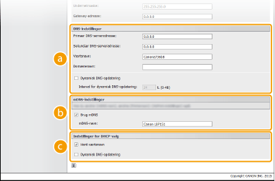 Markér afkrydsningsfeltet for automatisk at opdatere DNS-poster, hver gang tilknytningen mellem maskinens IP-adresse og dens værtsnavn ændres (f.eks. i et DHCP-miljø). Hvis du vil angive de adresser, du ønsker at registrere med DNS-serveren, skal du vælge et eller flere af afkrydsningsfelterne for [Registrer manuel adresse], [Registrer statisk adresse] og [Registrer dynamisk adresse]. Hvis du vil angive intervallet mellem opdateringerne, skal du angive tiden i timer i tekstfeltet [Interval for dynamisk DNS-opdatering]. Fjern markeringen i afkrydsningsfeltet, hvis du ikke ønsker at anvende dynamisk opdatering. [mDNS-indstillinger][Brug mDNS]