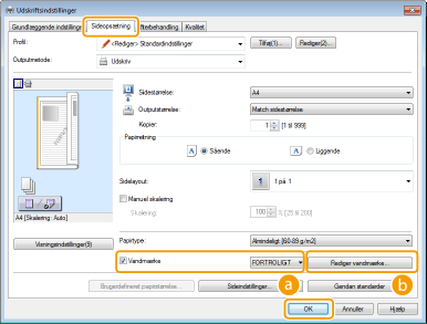 Du kan udskrive vandmærker, som f.eks. "KOPI" eller "FORTROLIGT" hen over dokumentet. Du kan oprette nye vandmærker eller bruge allerede registrerede vandmærker.