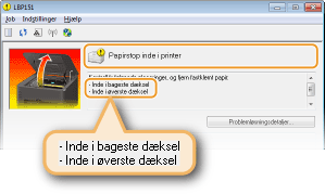 (Alarm), og meddelelsen <Papirstop inde i printer> og placeringen af papirstoppet vises i Vinduet Printerstatus. Fjern det papir, der sidder i klemme, i den viste rækkefølge for papirstopstederne ved hjælp af de procedurer, som er beskrevet i de afsnit, der henvises til nedenfor. Før start skal du læse sikkerhedsinstruktionerne under Vigtige sikkerhedsanvisninger omhyggeligt.