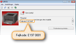 Der vises en fejlmeddelelse i Vinduet Printerstatus, hvis der er et problem med udskrivningsprocessen, hvis maskinen ikke kan kommunikere, eller hvis et andet problem forhindrer den normale drift. Se følgende liste for flere informationer om fejlmeddelelserne.