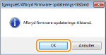Firmwareopdateringstilstanden kan annulleres, inden firmwaren opdateres. Klik på Vinduet Printerstatus' menu [Indstillinger]  [Hjælpeprogram]  [Igangsæt/Afbryd Firmware-opdaterings-tilstand]  [OK].
