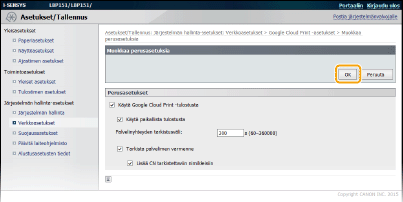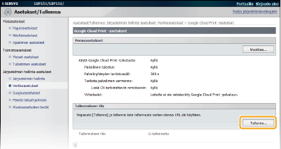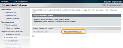 Ota käyttöön laitteen Google Cloud Print -toiminto. Voit myös poistaa käytöstä laitteen Google Cloud Print -toiminnon.