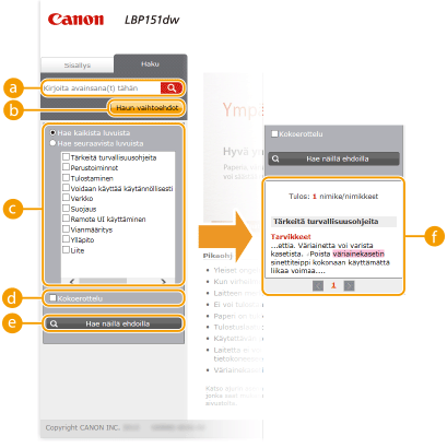 Napsauttamalla tätä voit vaihtaa [Sisällys]-välilehden ja [Haku]-välilehden välillä.