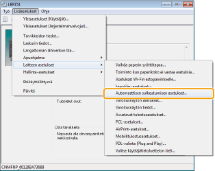 Voit asettaa laitteen sammuttamaan itsensä automaattisesti, kun se on ollut käyttämättä tietyn ajan. Tämä estää turhaa virrankulutusta, joka johtuu siitä, että laite unohdettiin sammuttaa. Tehtaan oletusaika ennen virran katkaisemista on 4 tuntia. Jos haluat muuttaa tätä asetusta, tee seuraavat toimet tulostimen tilaikkunassa.