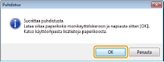 Laittaan sisällä olevaan kiinnitysyksikköön saattaa tarttua likaa, joka aiheuttaa tulosteisiin tahroja ja mustia raitoja. Jos näin tapahtuu, puhdista kiinnitysyksikkö noudattamalla seuraavia ohjeita. Huomaa, että kiinnitysyksikköä ei voi puhdistaa, kun laitteessa on tulostusta odottavia asiakirjoja. Kiinnitysyksikön puhdistamiseen tarvitaan tavallista A4-kokoista paperia. Lisää ennen aloittamista A4-kokoista paperia monikäyttötasolle.