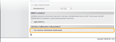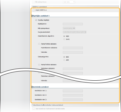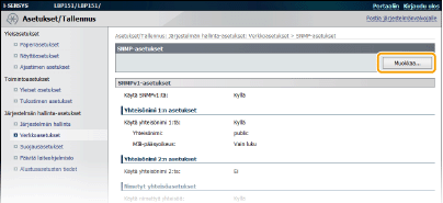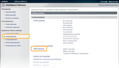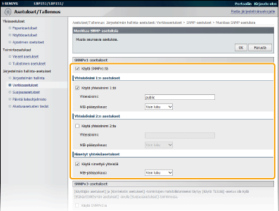 SNMP (Simple Network Management Protocol) on protokolla, jolla valvotaan ja ohjataan verkon tiedonsiirtolaitteita käyttämällä MIB-tietokantaa (Management Information Base). Laite tukee joko SNMPv1-protokollaa ja edistyneemmän suojauksen SNMPv3-protokollaa. Niiden avulla voit tarkistaa laitteen tilan tietokoneesta, kun tulostat asiakirjoja tai käytät Remote UI. Voit ottaa käyttöön SNMPv1:n, SNMPv3:n tai molemmat samanaikaisesti. Määritä kunkin version asetukset verkkoympäristöön ja käyttötarkoitukseen sopiviksi.