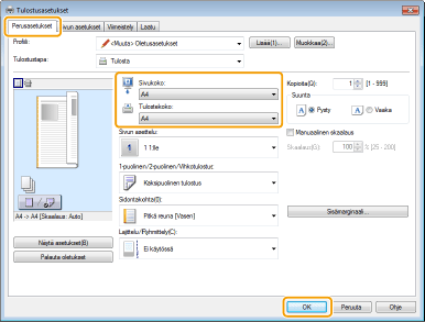 Valitusta paperikoosta riippuen et ehkä pysty asettamaan optimaalista suurennus-/pienennyssuhdetta. Tulosteessa saattaa esimerkiksi olla isoja tyhjiä kohtia tai osia asiakirjasta saattaa puuttua.