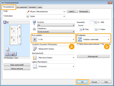 Voit tulostaa monta sivua yhdelle arkille. Voit esimerkiksi tulostaa neljä tai yhdeksän sivua yhdelle arkille käyttämällä asetusta [4 1:lle] tai [9 1:lle]. Käytä tätä toimintoa, kun haluat säästää paperia tai tarkastella asiakirjaa pikkukuvina.