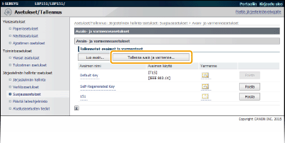 Avainparia ei voi poistaa, jos se on käytössä, esimerkiksi kun [TLS] tai [IEEE 802.1X] näytetään kohdassa [Avaimen käyttö]. Poista tässä tapauksessa toiminto käytöstä tai vaihda avainpari ennen sen poistamista. Valmiiksi asennettua CA-varmennetta ei voi poistaa.