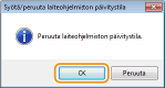 Laiteohjelmiston päivitystila voidaan peruuttaa ennen laiteohjelmiston päivittämistä. Valitse tulostimen tilaikkunan [Lisäasetukset]-valikko  [Apuohjelma]  [Aloita/peruuta laiteohjelmiston päivitystila]  [OK].