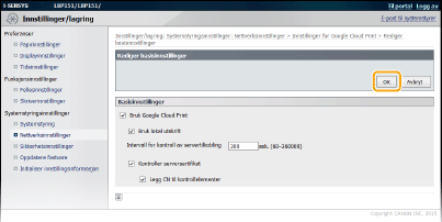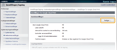 Du må aktivere Google Cloud Print. Klikk på [Rediger ], velg [Bruk Google Cloud Print]-avmerkingsboksen og klikk deretter på [OK].