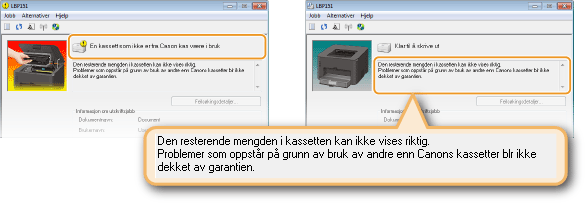 Hvis du fortsetter utskriften når <En kassett som ikke er fra Canon kan være i bruk> vises, klikk på