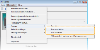 (Papir)-tast til å skrive ut en brukerdataliste. Vise nettverksinnstillingerAngi språk for utskrifterI skriverstatusvinduets [Alternativer]-meny
