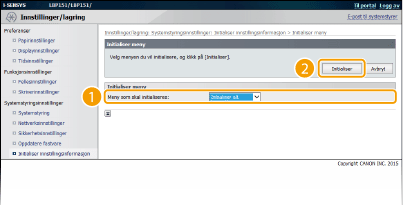 Velg innstillingene som skal nullstilles fra rullegardinlisten. Velg [Initialiser alt] for å nullstille alle innstillingene i [Displayinnstillinger], [Tidsinnstillinger], [Fellesinnstillinger] og [Skriverinnstillinger] samtidig.