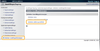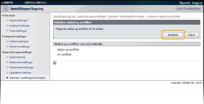 Du kan gjenopprette innstillingene for nøkkelpar (innstillinger for nøkkel og sertifikat) og CA-sertifikater til standardinnstillingene fra fabrikken. Merk at eventuelle nøkkelpar du har registrert i maskinen og CA-sertifikater (unntatt forhåndsinstallerte CA-sertifikater) vil bli slettet av nullstillingen.