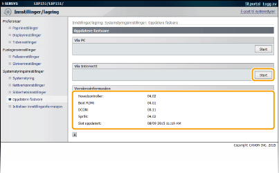 Velg en metode for oppdatering av fastvaren avhengig av hvordan maskinen er installert. Sjekk versjonen for maskinens fastvare og oppdater over Internett fra maskinen, eller oppdater fra en datamaskin der du har lastet ned fastvaren.