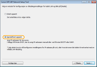 Etter å ha byttet tilkoblingsmetode fra trådløst LAN til kablet LANDu må avinstallere skriverdriveren som er installert nå, konfigurere den kablede LAN-tilkoblingen, og deretter installere skriverdriveren på nytt i henhold til Veiledning for installasjon av skriverdriver. Ved konfigurering av den kablede LAN-tilkoblingen, velg [Egendefinert oppsett] som konfigureringsmetode.