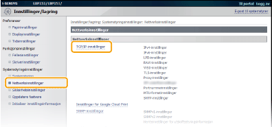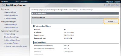Maskinens IPv4-adresse kan enten tilordnes automatisk av en dynamisk IP-adresseringsprotokoll, for eksempel DHCP, eller angis manuelt. Ved tilkobling av maskinen til et kablet LAN, sørg for at kontakten til LAN-kabelen er satt skikkelig inn i portene (Koble til et Koblet LAN).