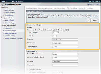 Velg [Av]. Hvis du velger [DHCP], [BOOTP], eller [RARP]-protokollen når disse tjenestene er utilgjengelige, vil maskinen sløse tid og kommunikasjonsressurser ved å søke etter disse tjenestene på nettverket.