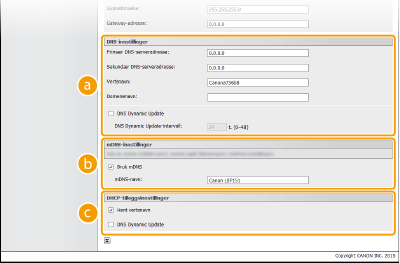 Merk av i avmerkingsboksen for en automatisk oppdatering av DNS-postene når tilknytningen mellom maskinens IP-adresse og vertsnavnet endres (for eksempel i et DHCP-miljø). Hvis du vil angi adressene du vil registrere på DNS-serveren, merker du av for en eller flere av avmerkingsboksene for [Lagre manuell adresse], [Lagre stateful-adresse] og [Lagre stateless-adresse]. For å angi intervallene mellom oppdateringer, angi tiden i timer i tekstboksen [DNS Dynamic Update-intervall]. Fjern merket i avmerkingsboksen hvis du ikke ønsker å bruke dynamisk oppdatering. [mDNS-innstillinger][Bruk mDNS]