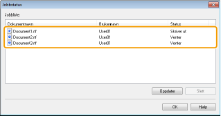 Kontrollere fra FjernkontrollDu kan kontrollere utskriftsstatusen på siden [Jobbstatus] i Fjernkontroll. Kontrollere den gjeldende statusen for utskriftsdokumenter