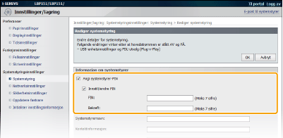 Merk av i [Angi systemstyrer-PIN]-avmerkingsboksen og tast inn PIN-koden.