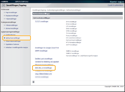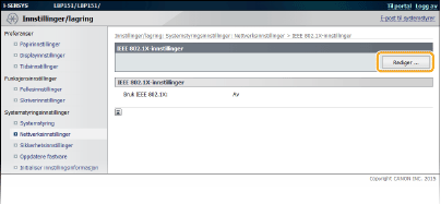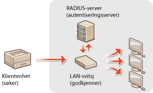 Maskinen kan koble til et 802.1X-nettverk som en klientenhet. Et typisk 802.1X-nettverk består av en RADIUS-server (autentiseringsserver), LAN-svitsj (godkjenner) og klientenheter med autentiseringsprogramvare (anmodere). Hvis en enhet forsøker å koble til 802.1X-nettverket, må enheten gå gjennom brukerautentisering for å bevise at tilkoblingen utføres av en godkjent bruker. Autentiseringsinformasjonen sendes til og kontrolleres av en RADIUS-server, som tillater eller avviser kommunikasjon til nettverket avhengig av autentiseringsresultatet. Hvis autentiseringen mislykkes, blokkerer en LAN-svitsj (eller et tilgangspunkt) tilgangen fra utsiden av nettverket.
