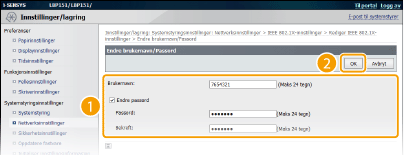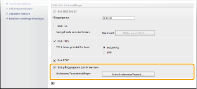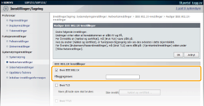 Merk av for [Bruk IEEE 802.1X], tast inn loginnavnet i [Påloggingsnavn]-tekstboksen og angi de nødvendige innstillingene.