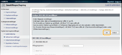Maskinen og autentiseringsserveren autentiserer hverandre ved å gjensidig verifisere sertifikatene deres. Et nøkkelpar utstedt av en sertifiseringsinstans (CA) kreves for klientautentisering (ved autentisering av maskinen). For serverautentisering kan et CA-sertifikat installert via Fjernkontroll brukes i tillegg til et CA-sertifikat forhåndsinstallert i maskinen. TLS-metoden kan ikke brukes med TTLS eller PEAP samtidig.