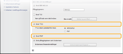 Sett merke i avkrysningsboksen [Bruk TTLS] eller [Bruk PEAP].