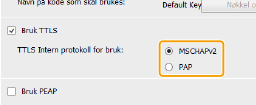 Denne autentiseringsmetoden bruker et brukernavn og passer for klientautentisering og et CA-sertifikat for serverautentisering. MSCHAPv2 eller PAP kan velges som intern protokoll. TTLS kan brukes med PEAP samtidig. Aktiver TLS for Fjernkontroll før du konfigurerer denne autentiseringsmetoden (