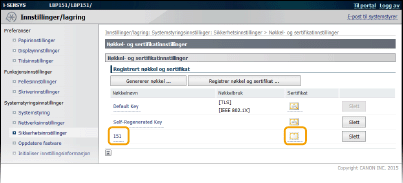 Et nøkkelpar kan ikke slettes hvis det er i bruk for et formål, for eksempel når [TLS] eller [IEEE 802.1X] vises under [Nøkkelbruk]. I dette tilfellet må du deaktivere funksjonen eller erstatte nøkkelparet før du sletter det. De forhåndsinstallerte CA-sertifikatene kan ikke slettes.