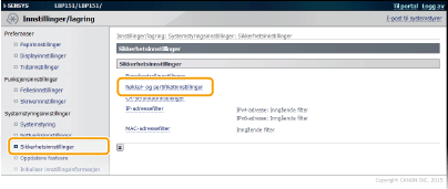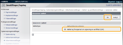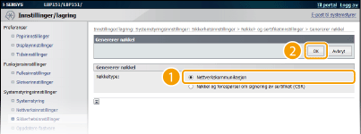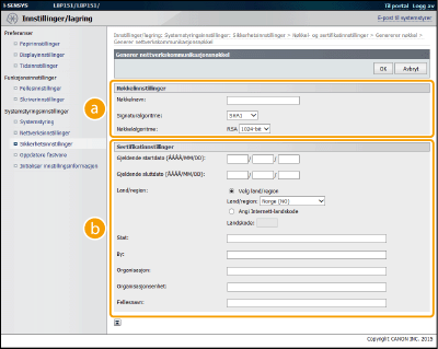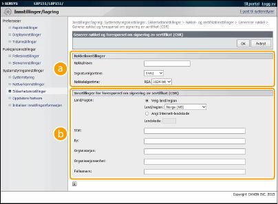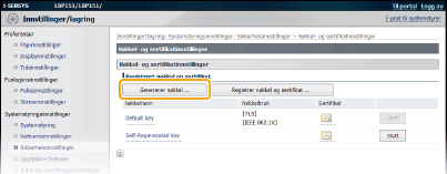 Et nøkkelpar kan genereres av maskinen når det kreves for kryptert kommunikasjon via Transport Layer Security (TLS). Du kan bruke TLS når du får tilgang til maskinen via Fjernkontroll. Opptil fem nøkkelpar, inkludert de forhåndsinstallerte parene, kan registreres. Selvsignerte sertifikater brukes med nøkkelpar generert i "Network Communication" (nettverkskommunikasjon). Med en "Key and Certificate Signing Request (CSR)" (nøkkel og forespørsel om signering av sertifikat) kan du søke om et CA-utstedt digitalt sertifikat for nøkkelparet generert av maskinen.