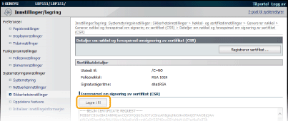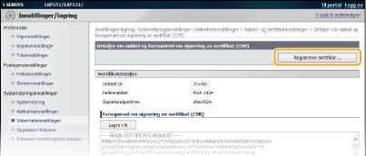 Du kan ikke bruke nøkkelparet som genereres av forespørselen om signering av sertifikat (CSR) før sertifikatet er registrert. Etter at sertifiseringsinstansen har utstedt det digitale sertifikatet, registrer det ved å følge fremgangsmåten nedenfor.