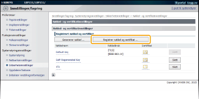 Klikk på [Registrer nøkkel og sertifikat] eller [Registrer CA-sertifikat].