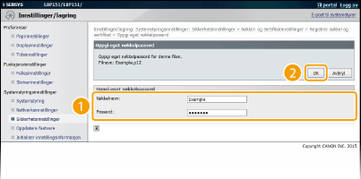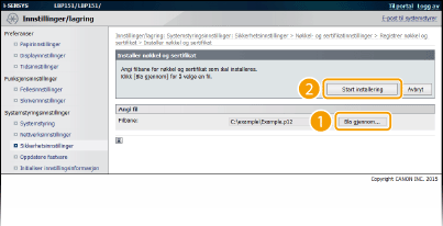 Nøkkelpar og digitale sertifikater kan skaffes fra en sertifiseringsinstans (CA) for bruk med maskinen. Etter å ha hentet dem fra en CA, kan du installere og registrere nøkkelpar og CA-sertifikatfiler på maskinen ved å bruke Fjernkontroll. Sørg for at nøkkelparene og sertifikatet tilfredsstiller kravene for maskinen (