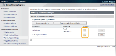 Klikk på [Nøkkel- og sertifikatinnstillinger] eller [CA-sertifikatinnstillinger].