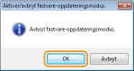 Fastvareoppdateringsmodus kan avbrytes før fastvaren er oppdatert. Klikk på menyen [Alternativer] i skriverstatusvinduet  [Verktøy]  [Aktiver/avbryt fastvare-oppdateringsmodus]  [OK].