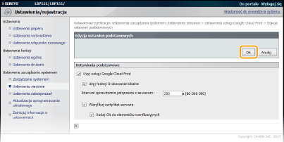 Należy włączyć usługę Google Cloud Print. Kliknij [Edycja], zaznacz pole wyboru [Użyj usługi Google Cloud Print] a następnie kliknij przycisk [OK].