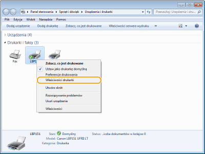 Kliknij prawym przyciskiem myszy ikonę drukarki i kliknij polecenie [Właściwości drukarki] (lub [Właściwości]).