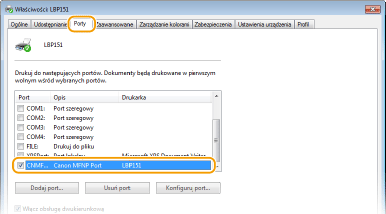 Jeśli w polu [Opis] obok wybranego portu widoczny jest komunikat [Canon MFNP Port], a urządzenie i komputer należą do tej samej podsieci, połączenie zostanie utrzymane i nie trzeba dodawać nowego portu. Jeśli wyświetlany jest komunikat [Standard TCP/IP Port], należy dodać nowy port. Konfiguracja portów drukarki