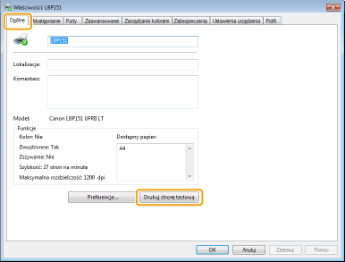 Kliknij kartę [Ogólne], po czym kliknij opcję [Drukuj stronę testową].