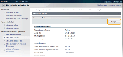 Adres IPv4 może być przypisywany automatycznie za pośrednictwem protokołu dynamicznego przydzielania adresu IP, takiego jak DHCP, lub można wprowadzić go ręcznie. W przypadku podłączania urządzenia do przewodowej sieci LAN należy upewnić się, że złącza kabla LAN zostały poprawnie umieszczone w portach (Podłączanie do Sieć LAN Przewodowa).