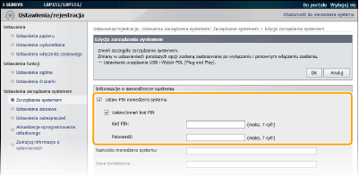 Zaznacz pole wyboru [Ustaw PIN menedżera systemu] i wprowadź kod PIN.