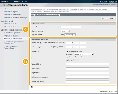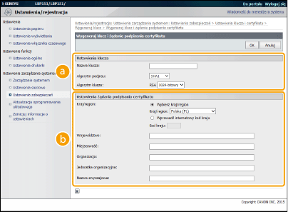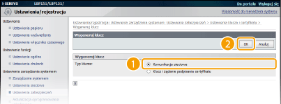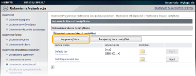 Parę kluczy można wygenerować za pomocą urządzenia, jeśli wymaga tego komunikacja szyfrowana z użyciem protokołu TLS (Transport Layer Security). Z szyfrowania TLS można korzystać podczas uzyskiwania dostępu do urządzenia przez Zdalny interfejs użytkownika. Dla urządzenia można zarejestrować maksymalnie pięć par kluczy, wliczając fabrycznie zainstalowane pary kluczy. Dla par kluczy wygenerowanych w sekcji „Komunikacja sieciowa” używane są certyfikaty z podpisem własnym. Przy użyciu klucza i żądania podpisania certyfikatu (CSR) można wysłać żądanie certyfikatu cyfrowego wygenerowanego przez CA dla pary kluczy wygenerowanych przez urządzenie.