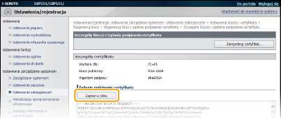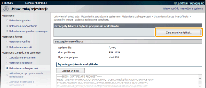 Nie można korzystać z pary kluczy wygenerowanej poprzez żądanie podpisania certyfikatu (CSR) do momentu zarejestrowania certyfikatu. Po wydaniu certyfikatu cyfrowego przez urząd certyfikacji można go zarejestrować, korzystając z poniższej procedury.