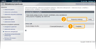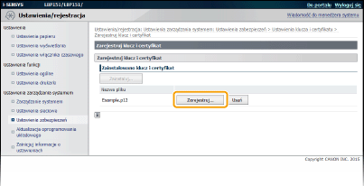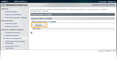 Kliknij pozycję [Ustawienia klucza i certyfikatu], aby zainstalować parę kluczy, lub [Ustawienia certyfikatu CA] w celu zainstalowania certyfikatu CA.
