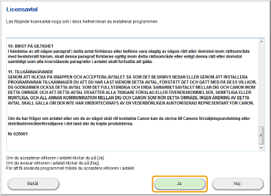 Läs licensavtalet och godkänn det genom att klicka på [Ja].